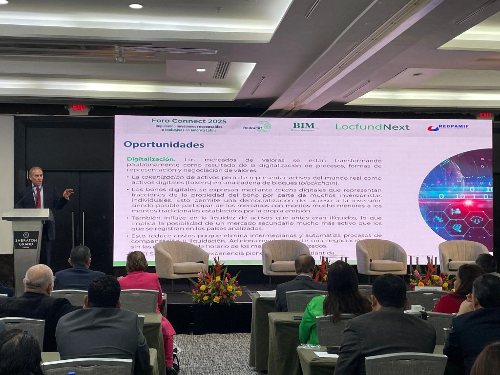 Cesar Castillo presentó la ponencia inaugural sobre la coyuntura regional, destacando el impacto de la volatilidad económica, el avance de la inteligencia artificial, la tokenización como nuevo mecanismo de acceso a activos y la necesidad de fortalecer la institucionalidad para acceder al mercado de valores.